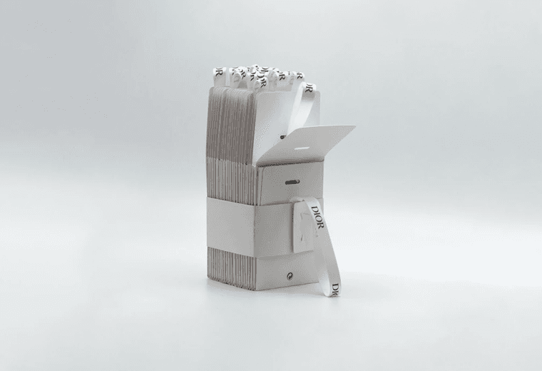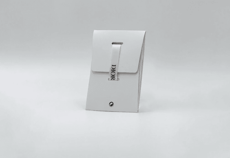 Produced by Favini, this 100% recycled paper blends minimal processing with refined texture, making each sheet subtly unique with organic fibers visible through the surface. Its natural whiteness and firm 350 g weight give the pouch a luxurious yet responsible character, perfectly aligned with Dior’s vision for greener soft packaging.