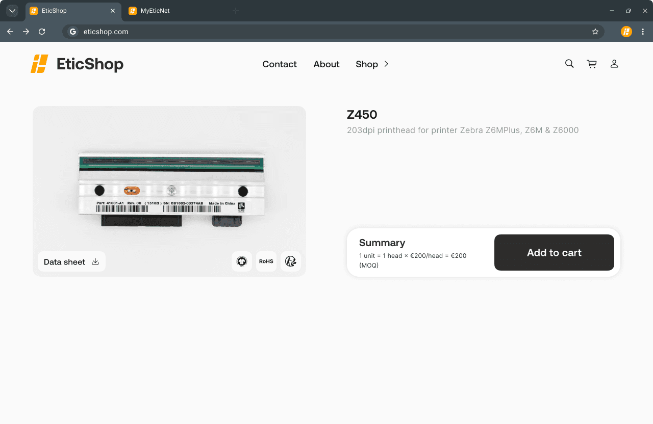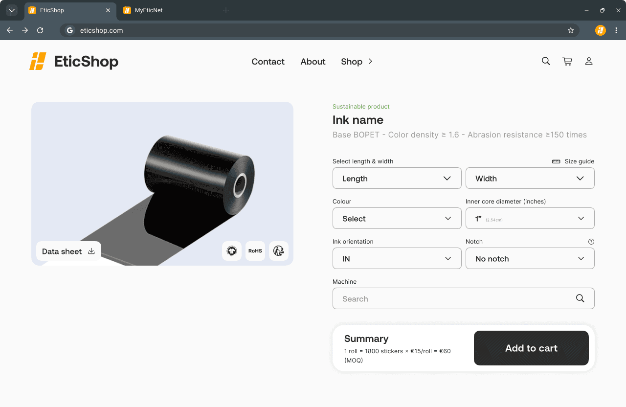 Etic Europe needed to expand beyond its historical textile base. EticShop was designed to capture new B2B clients by selling single-unit consumables like ink rolls, blank stickers, ribbons, and printheads. This accessible entry point strategically opens the door to high-value sales; including MyEticNet, packaging supplies and RFID.