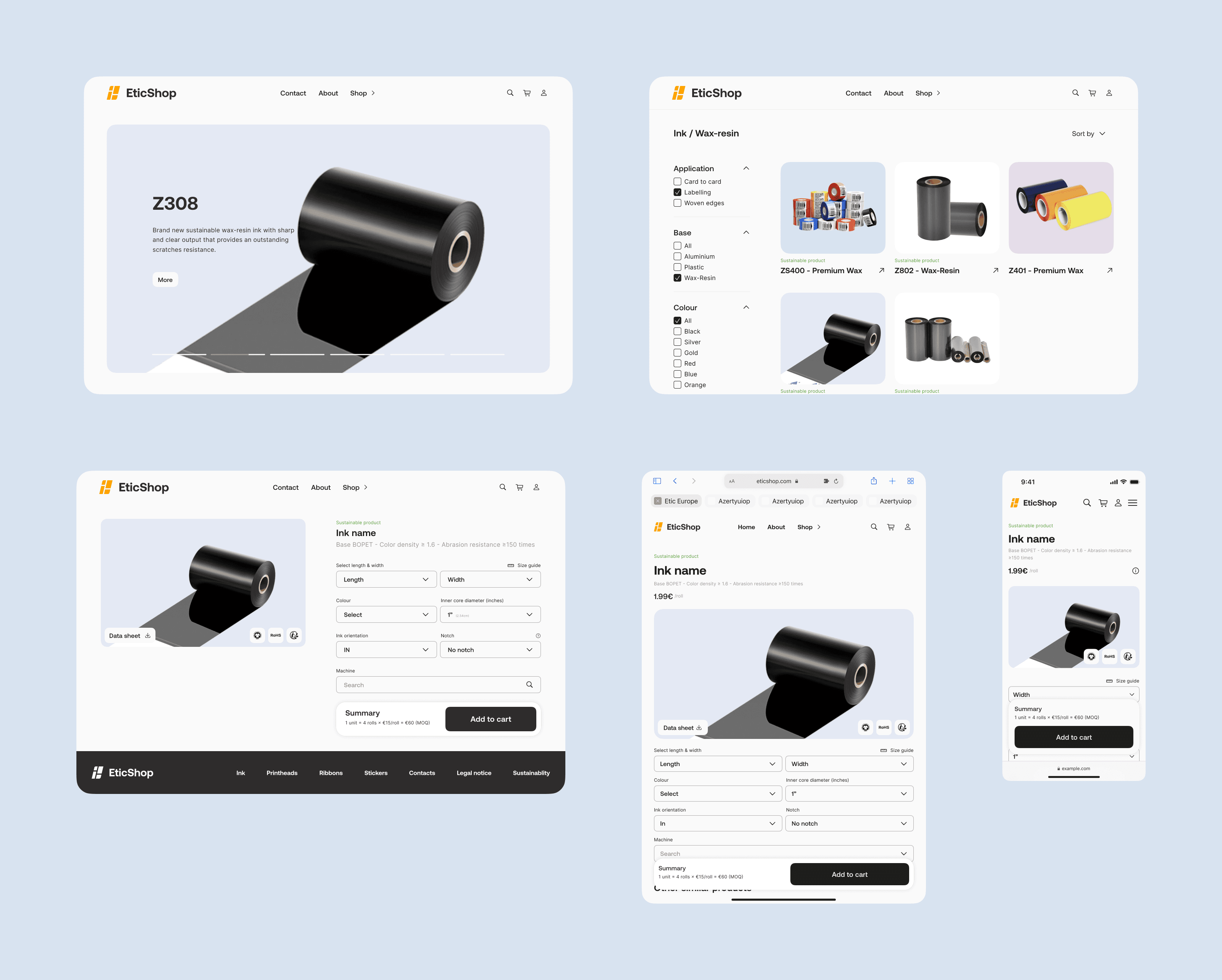 The product pages are the cornerstone of Eticshop’s value proposition, meticulously designed to transform potentially overwhelming technical specifications into a clear, guided purchasing experience for B2B clients. Instead of simply listing products, we developed custom configurators for each of the four main categories (Ink rolls, Stickers, Ribbons, Printheads) to cater to their specific selection logics, eliminating purchase anxiety and ensuring compatibility.