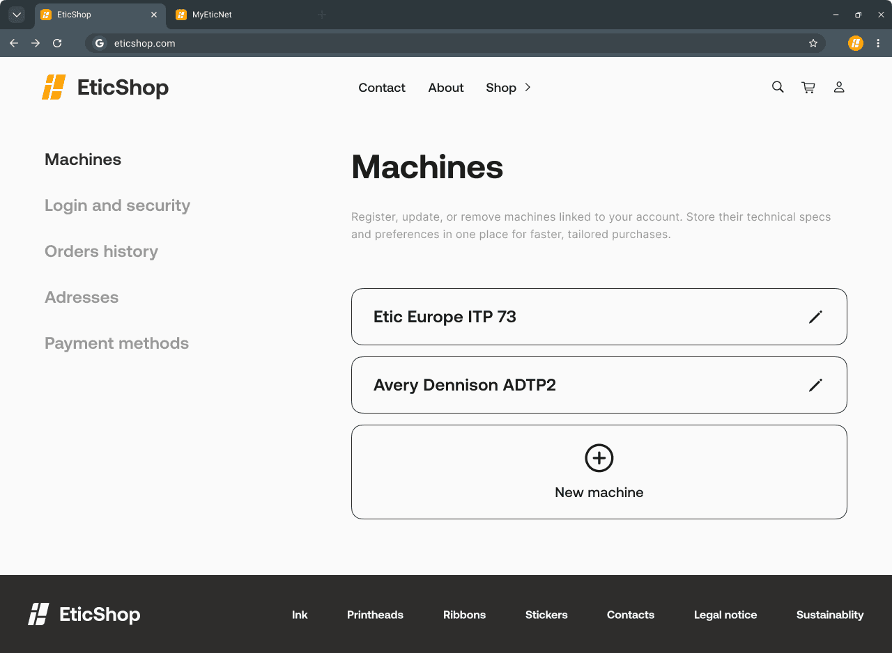 The ultimate retention feature lies in the user profile. Returning clients can save their exact printer models into their account, regardless of whether it is an Etic Europe machine or equipment from another brand. Once a machine is registered, the entire Eticshop catalog automatically filters itself to display only compatible consumables for that specific user. This guarantees zero compatibility errors on future visits and turns the repetitive restocking process into a highly personalized, foolproof experience.