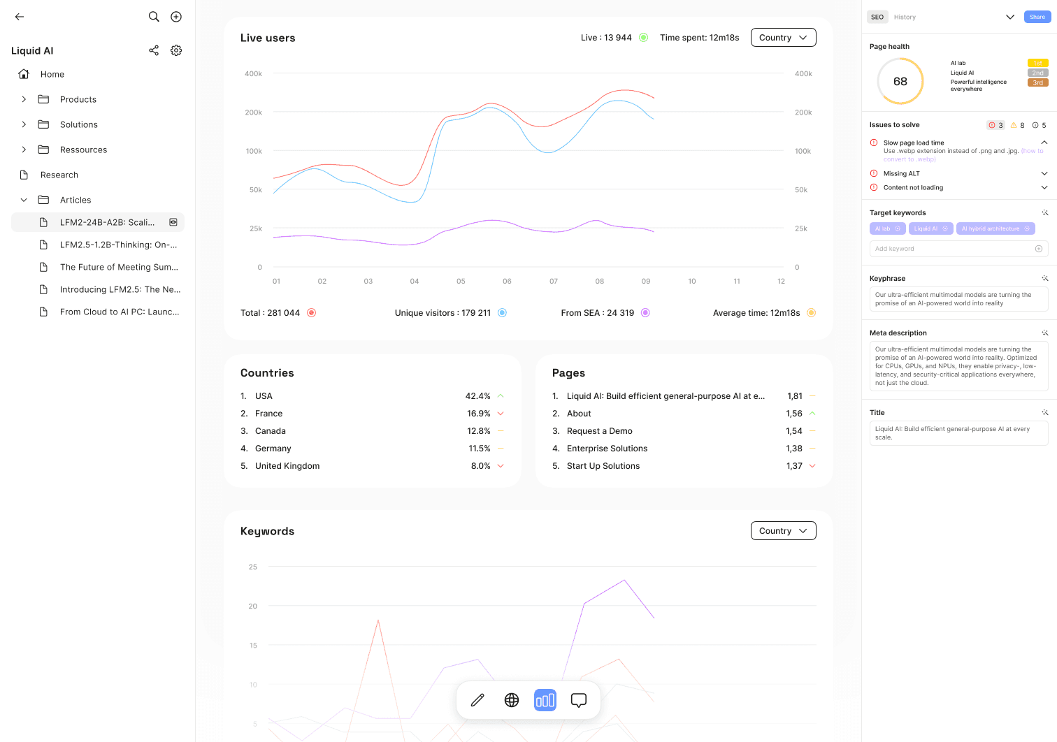 The goal was to bring SEO, AI, and audience intelligence directly into the creative workflow. Sewow was designed as an embedded system that guides structure, content, and strategy in real time, enabling teams to build search-optimized experiences before publication, not after.